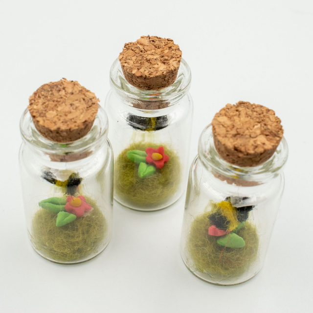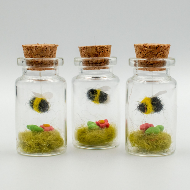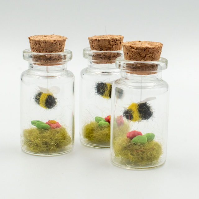 This tiny bee, has been lovingly handmade using the dry needle felting technique, which involves using special barbed needles to sculpt the wool into shape. Its wings are waxed paper and he floats in the space on a delicate cotton thread. The garden area in made from needle felted green wool and hand made polymer clay flowers and leaves. His home is a glass bottle with a cork lid.