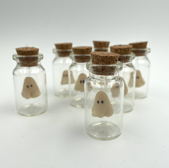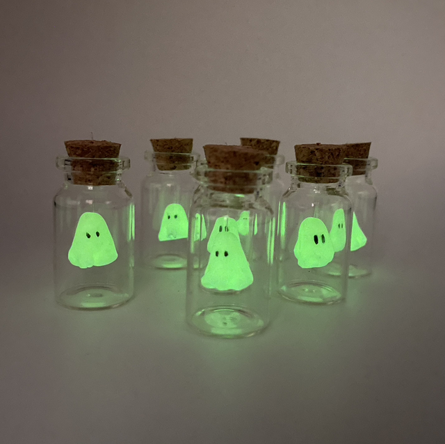 This tiny glow-in-the-dark ghost, has been lovingly handmade using polymer clay. It floats gently in its glass bottle home with a cork lid.
