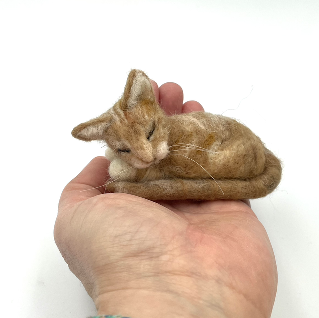 Needle felted cat made with 100% wool and horse hair whiskers and eyebrows.
