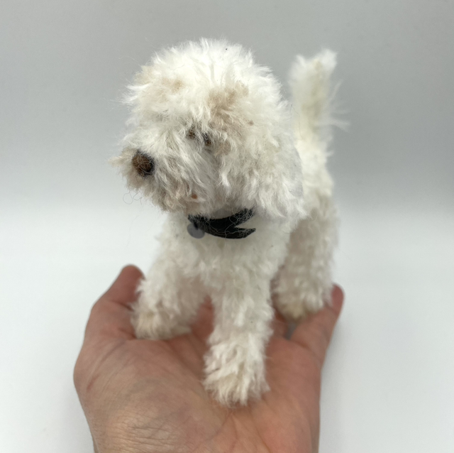 Needle felted Teeny made with 100% wool fibre, mixed yarn, glass eyes, leather collar and hand made polymer clay tag. Built onto a handmade wire armature.